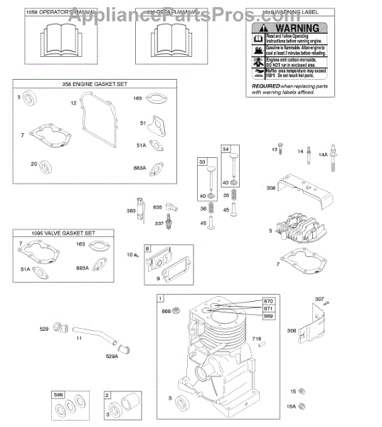 Parts for Briggs & Stratton 095412-0502-B1: Cylinder, Cylinder Head, Gasket Set - Engine, Gasket Set - Valve, Operator's Manual, Warning Label Parts