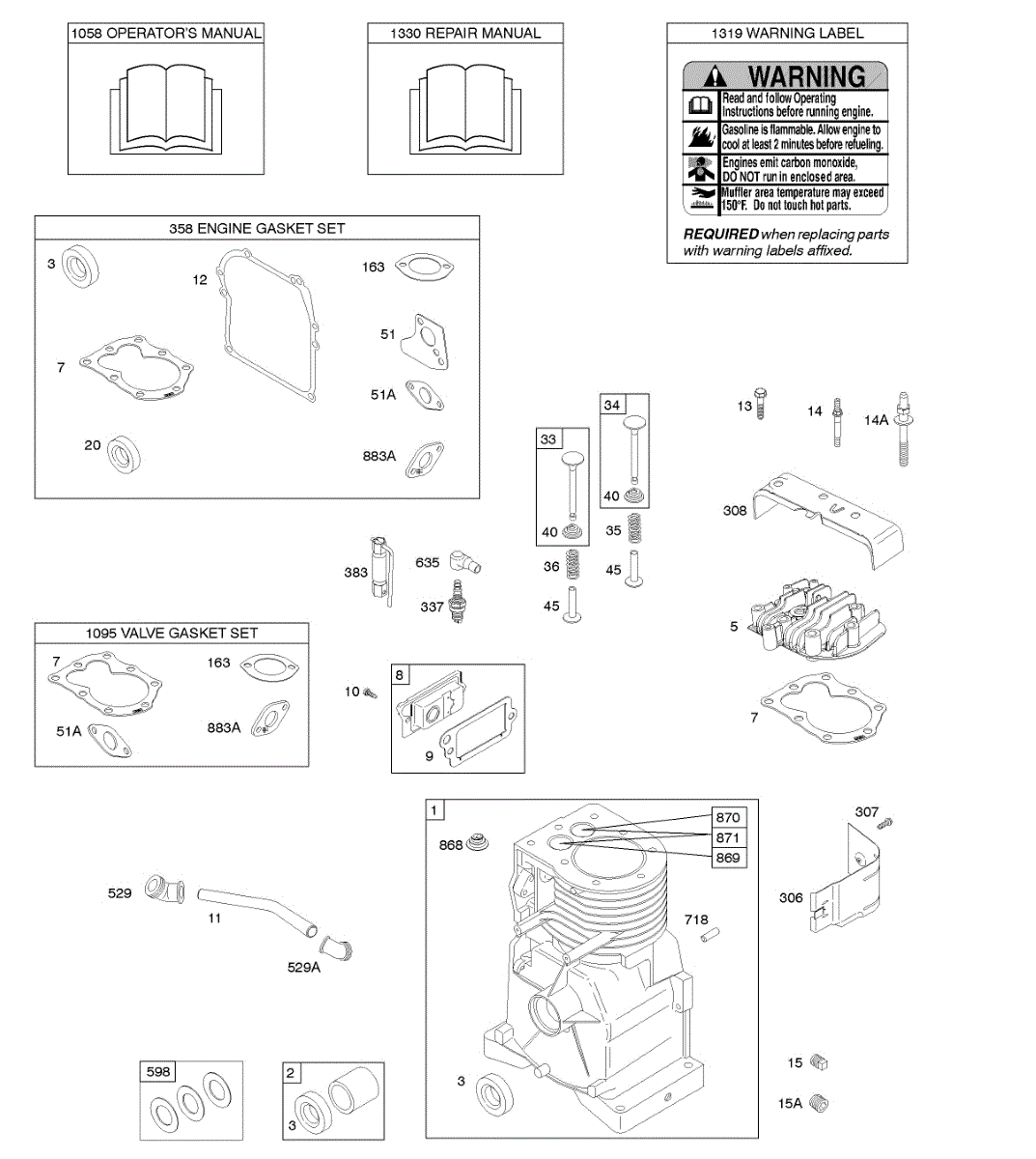 Parts for Briggs & Stratton 095452-0119-B1: Cylinder, Cylinder Head, Gasket Set - Engine, Gasket Set - Valve, Operator's Manual, Warning Label Parts