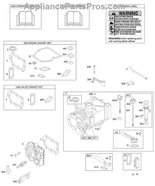 Parts for Briggs & Stratton 098982-0319-02: Cylinder, Cylinder Head, Gasket Set - Engine, Gasket Set - Valve, Lubrication, Operator's Manual, Warning Label Parts