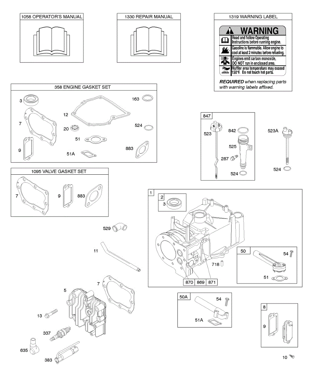 Parts for Briggs & Stratton 09F902-0113-B1: Cylinder, Cylinder Head, Gasket Set - Engine, Gasket Set - Valve, Lubrication, Operator's Manual, Warning Label Parts