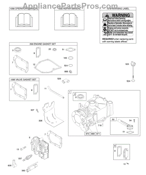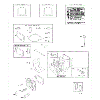 Parts for Briggs & Stratton 09K902-0323-E1: Cylinder, Cylinder Head, Gasket Set - Engine, Gasket Set - Valve, Lubrication, Operator's Manual, Warning Label Parts