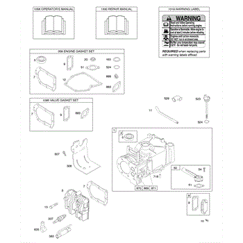 Parts for Briggs & Stratton 09M902-0112-E1: Cylinder, Cylinder Head, Gasket Set - Engine, Gasket Set - Valve, Lubrication, Operator's Manual, Warning Label Parts