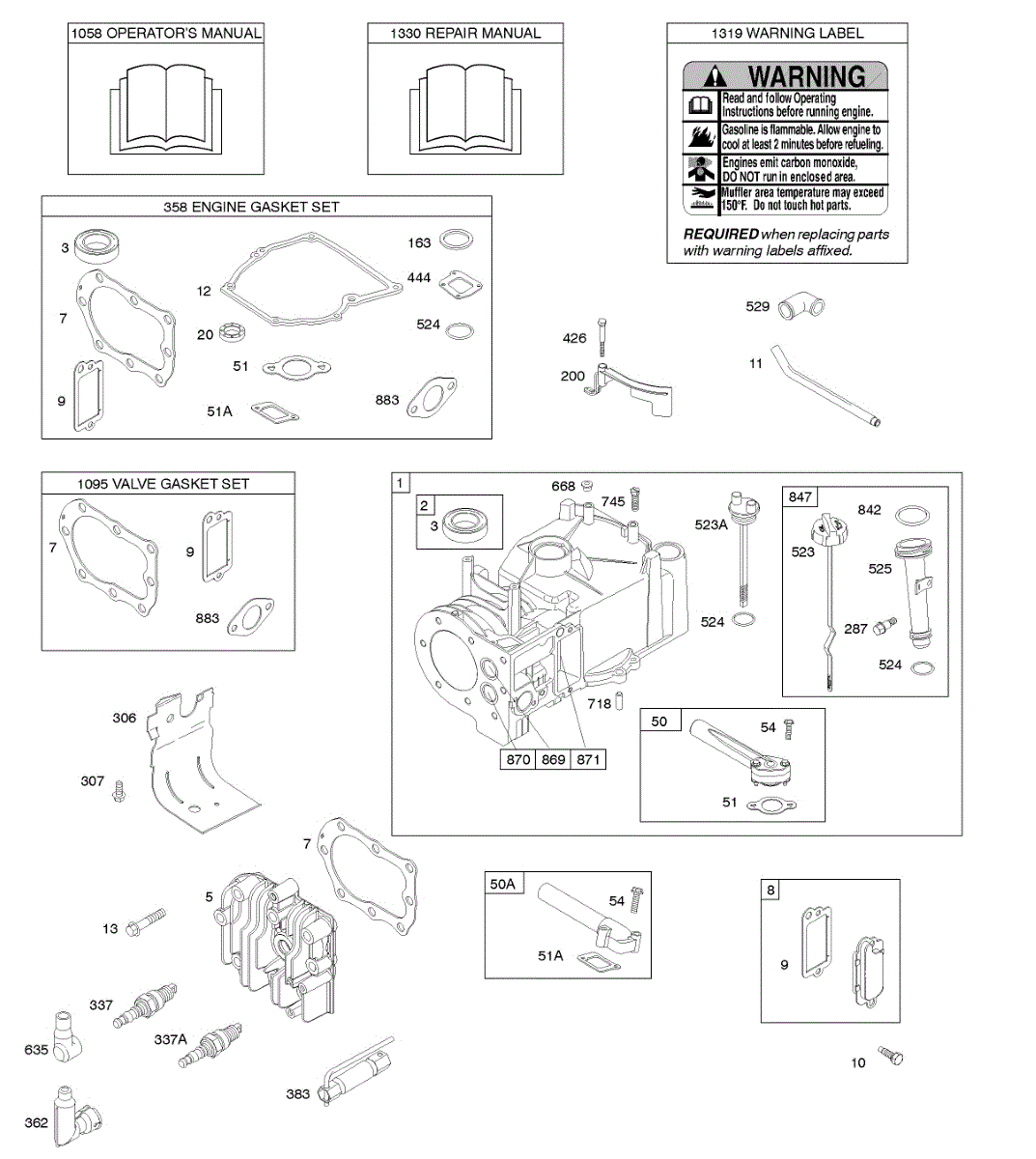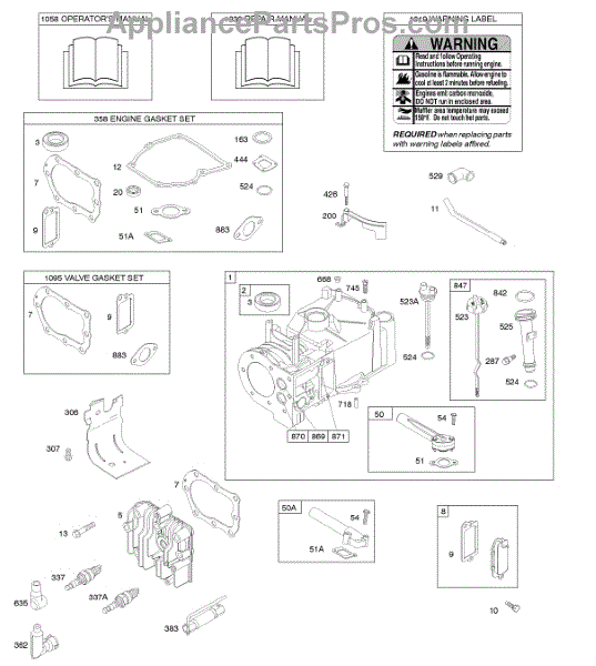 Parts for Briggs & Stratton 10A982-0173-01: Cylinder, Cylinder Head, Gasket Set - Engine, Gasket Set - Valve, Lubrication, Operator's Manual, Warning Label Parts