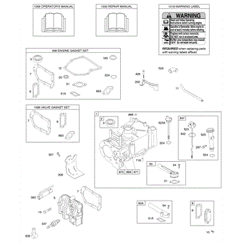 Parts for Briggs & Stratton 10B902-2005-E1: Cylinder, Cylinder Head, Gasket Set - Engine, Gasket Set - Valve, Lubrication, Operator's Manual, Warning Label Parts