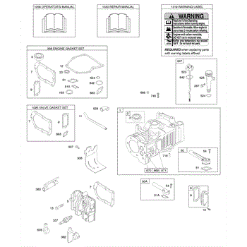 Parts for Briggs & Stratton 10E902-0015-B1: Cylinder, Cylinder Head, Gasket Set - Engine, Gasket Set - Valve, Lubrication, Operator's Manual, Warning Label Parts