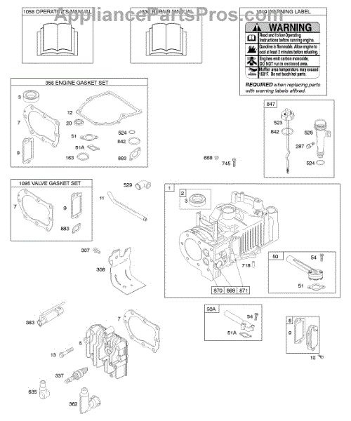 Parts for Briggs & Stratton 10E902-0119-B1: Cylinder, Cylinder Head, Gasket Set - Engine, Gasket Set - Valve, Lubrication, Operator's Manual, Warning Label Parts