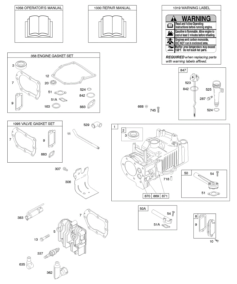 Parts for Briggs & Stratton 10E902-0121-B1: Cylinder, Cylinder Head, Gasket Set - Engine, Gasket Set - Valve, Lubrication, Operator's Manual, Warning Label Parts