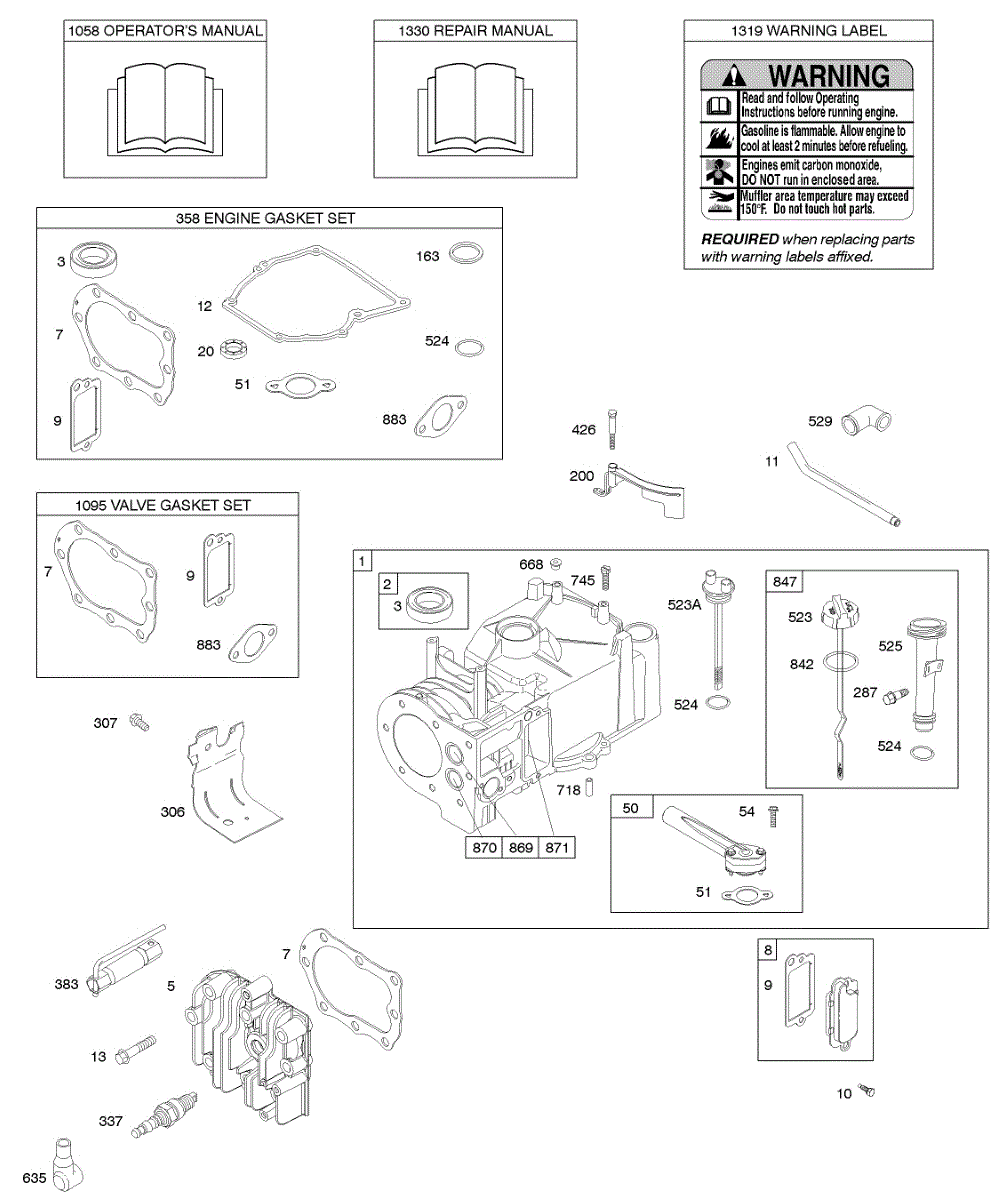 Parts for Briggs & Stratton 10H902-0114-E1: Cylinder, Cylinder Head, Gasket Set - Engine, Gasket Set - Valve, Lubrication, Operator's Manual, Warning Label Parts