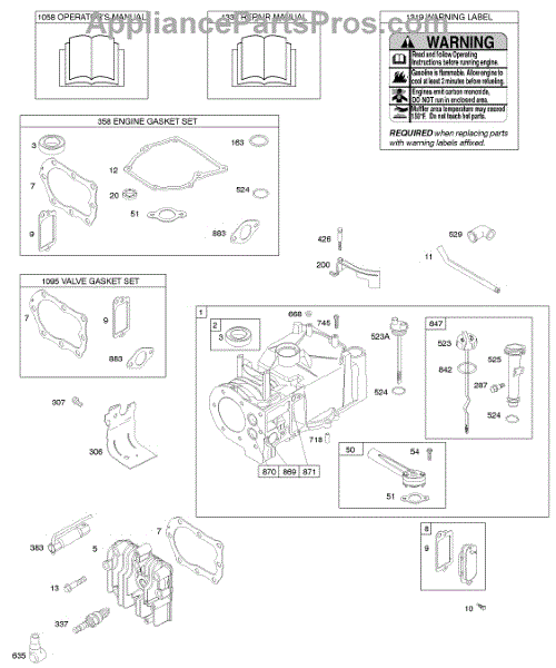 Parts for Briggs & Stratton 10J902-0140-E1: Cylinder, Cylinder Head, Gasket Set - Engine, Gasket Set - Valve, Lubrication, Operator's Manual, Warning Label Parts