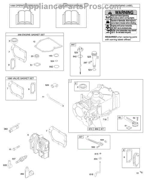 Parts for Briggs & Stratton 10S902-0554-B1: Cylinder, Cylinder Head, Gasket Set - Engine, Gasket Set - Valve, Lubrication, Operator's Manual, Warning Label Parts