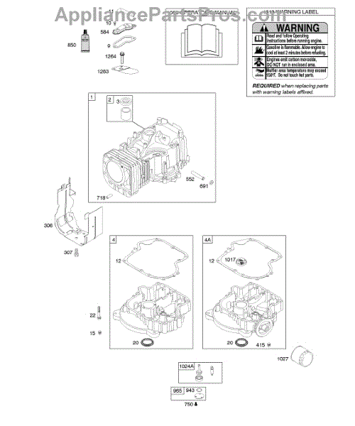 Parts for Briggs & Stratton 215907-0124-E9: Cylinder, Engine Sump, Operator's Manual, Warning Label Parts
