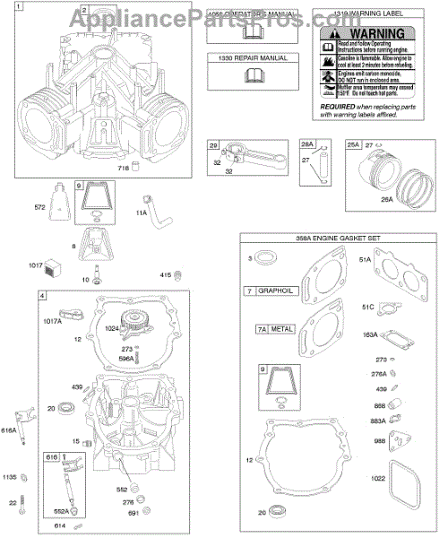 Parts for Briggs & Stratton 351777-0100-01: Cylinder, Engine Sump, Gasket Set - Engine, Piston, Rings, Connecting Rod Parts