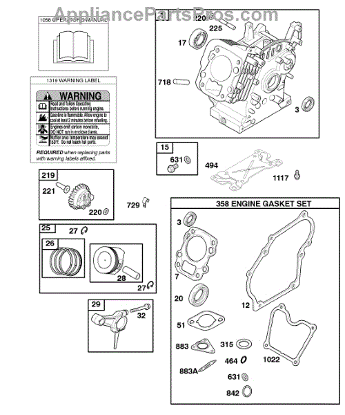 Parts for Briggs & Stratton 050032-0116-E1: Cylinder, Gasket Set - Engine, Operator's Manual, Piston, Rings, Connecting Rod, Warning Label Parts