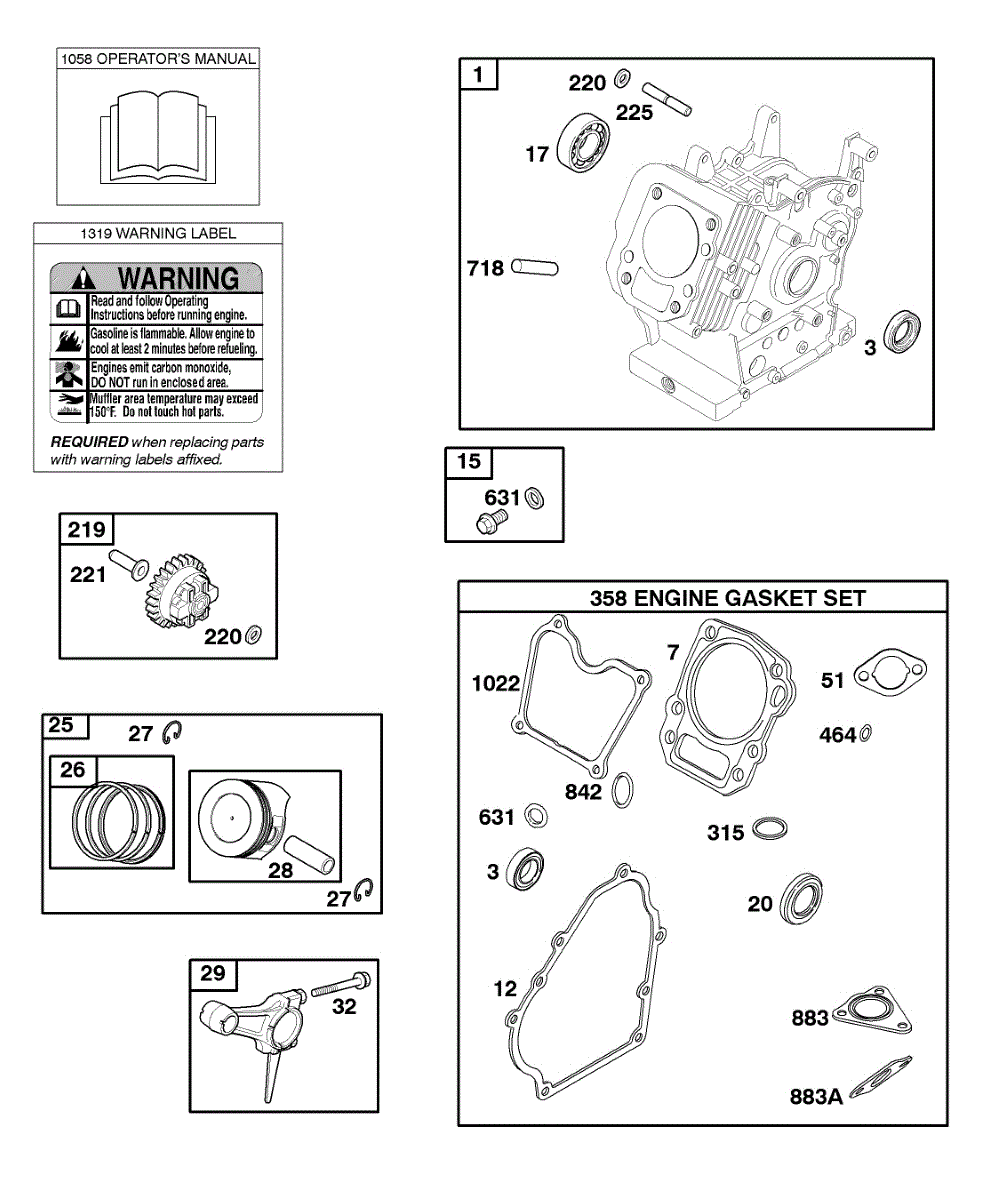 Parts for Briggs & Stratton 086432-0135-B1: Cylinder, Gasket Set-Engine, Operator's Manual, Piston, Rings, Connecting Rod, Warning Label Parts