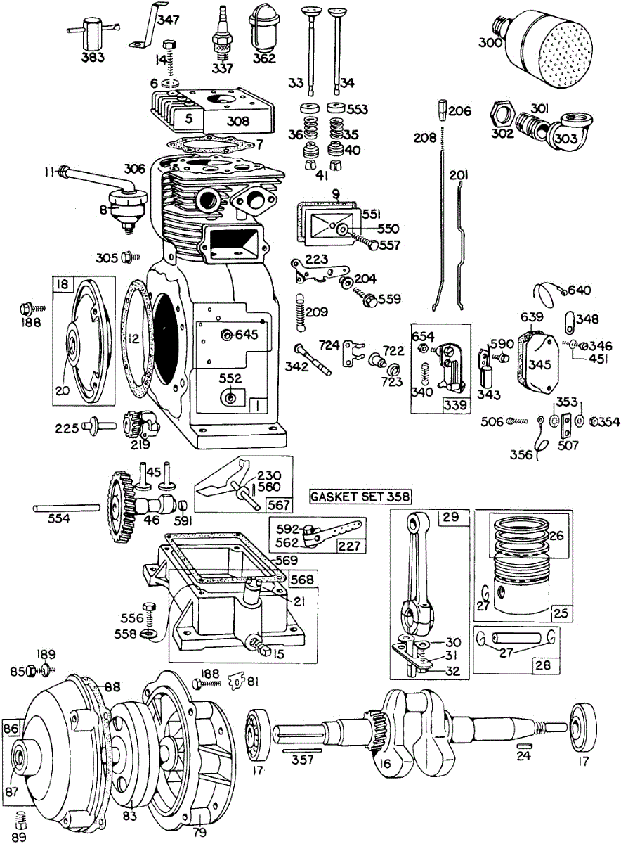 Parts for Briggs & Stratton 200454-0198-99: Cylinder,Gear Case,Piston Parts