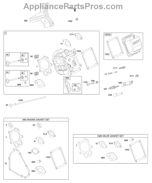 Parts for Briggs & Stratton 20E214-0358-E1: Cylinder Head, Gasket Set - Engine, Gasket Set - Valve, Valves Parts