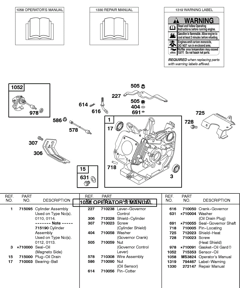Parts for Briggs & Stratton 187432-0110-B1: Cylinder, Oil Sensor Group, Operator's Manual, Repair Manual, Warning Label Parts