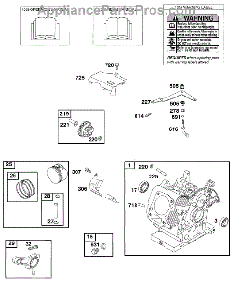 Parts for Briggs & Stratton 118432-0140-B1: Cylinder, Operator's Manual, Piston, Rings, Connecting Rod, Warning Label Parts