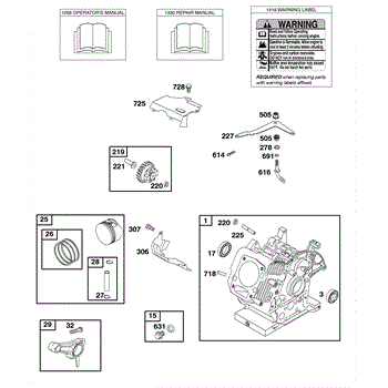 Parts for Briggs & Stratton 118432-0150-E1: Cylinder, Operator's Manual, Piston, Rings, Connecting Rod, Warning Label Parts
