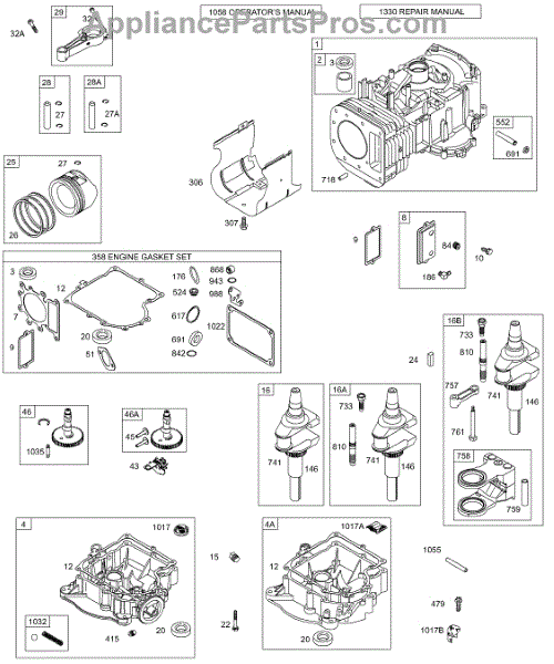 Parts for Briggs & Stratton 28P777-0026-02: Cylinder, Piston / Rings, Breather, Engine Gaskets, Sump, Crankshaft, Cam, Counterweight Parts