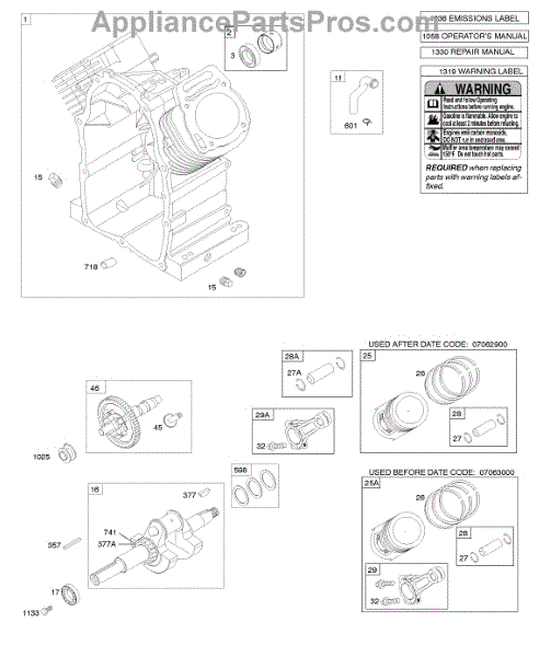 Parts for Briggs & Stratton 385447-0123-G1: Cylinder, Piston / Rings / Connecting Rod, Camshaft Parts