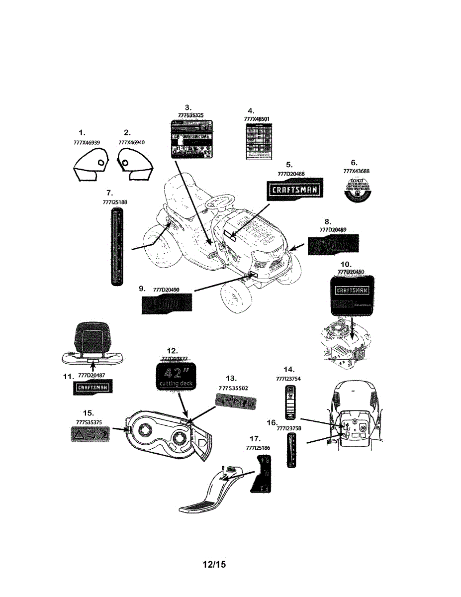 Decal label for riding mowers and lawn tractors. Installs on exterior panels. Replace if faded, peeling, damaged, or missing for restored appearance.