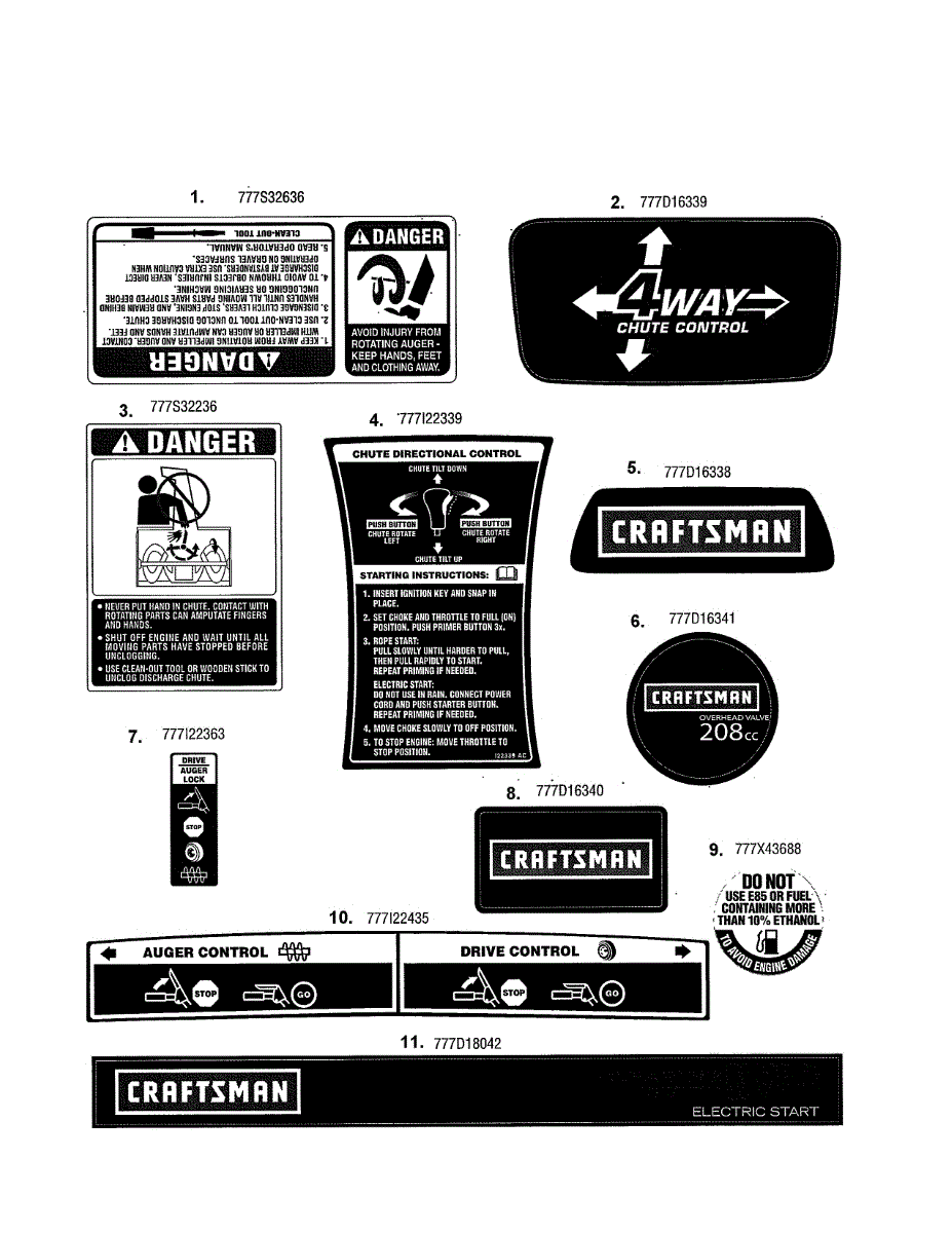 Replacement start/chute instruction label for gas snowblowers. Adheres to control panel or chute area. Replace if worn, faded, peeling, or missing.