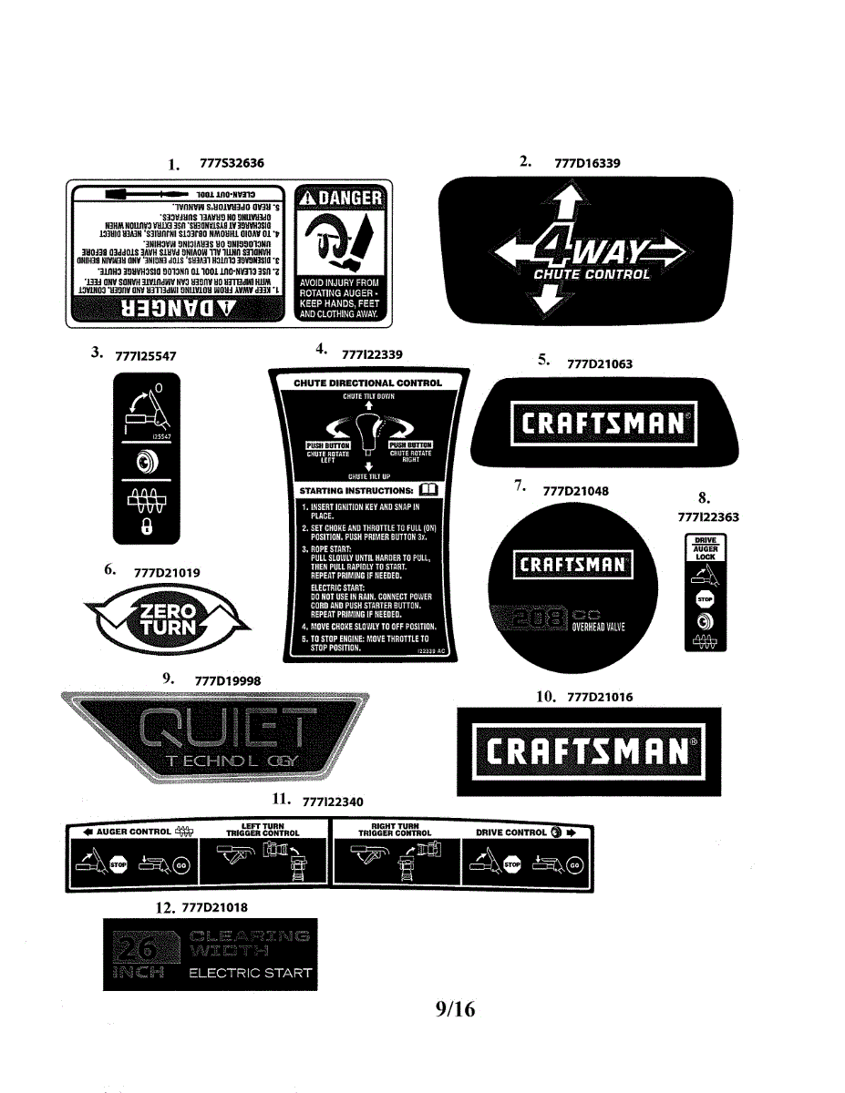 Control label for snowblower auger, drive, and steering mechanisms. Replaces faded, peeling, or missing instruction labels on control panel.