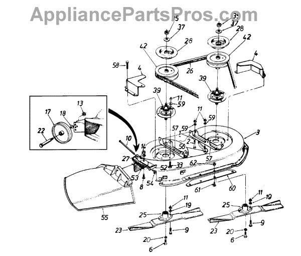 Blade adapter that mounts between the mower blade and spindle shaft. Replace if cracked, stripped, or worn to ensure secure blade attachment and safe operation.