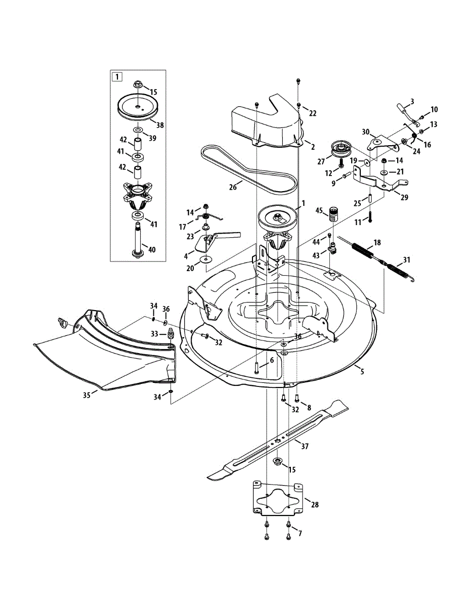 Spindle assembly for lawn tractor mower decks. Connects blade to drive belt for cutting operation. Replace if cracked, worn, or damaged bearings.