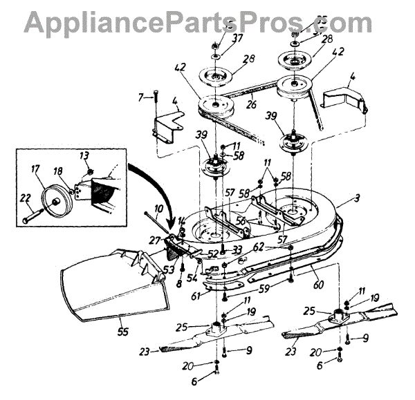 Blade adapter that mounts between the mower blade and spindle shaft. Replace if cracked, stripped, or worn to ensure secure blade attachment and safe operation.