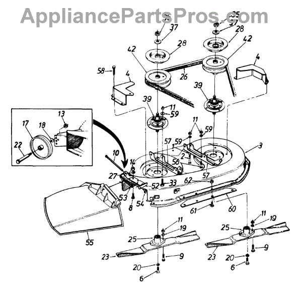 Blade adapter that mounts between the mower blade and spindle shaft. Replace if cracked, stripped, or worn to ensure secure blade attachment and safe operation.