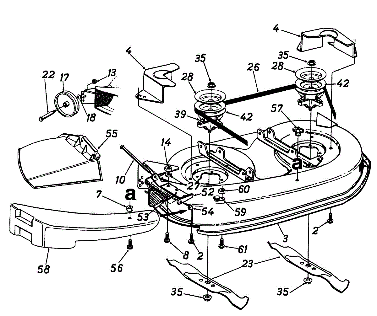 Complete 38-inch mower deck assembly for lawn tractors. Replaces cracked, rusted, or damaged decks. Includes mounting points and structural housing.