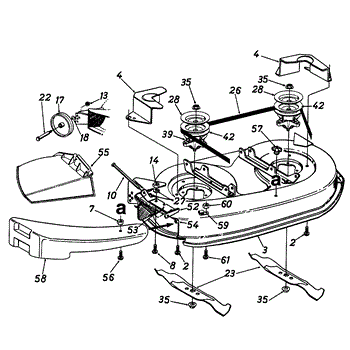 Complete 38-inch mower deck assembly for lawn tractors. Replaces cracked, rusted, or damaged decks. Includes mounting points and structural housing.