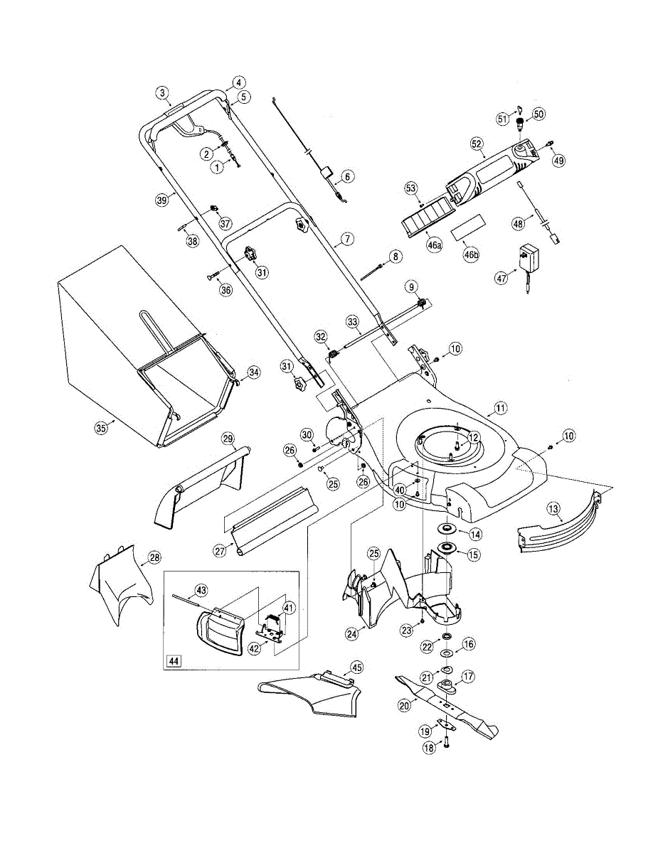 Grass bag frame assembly for walk-behind mowers. Replaces cracked, broken, or worn frames that no longer hold the bag securely in place during mowing.