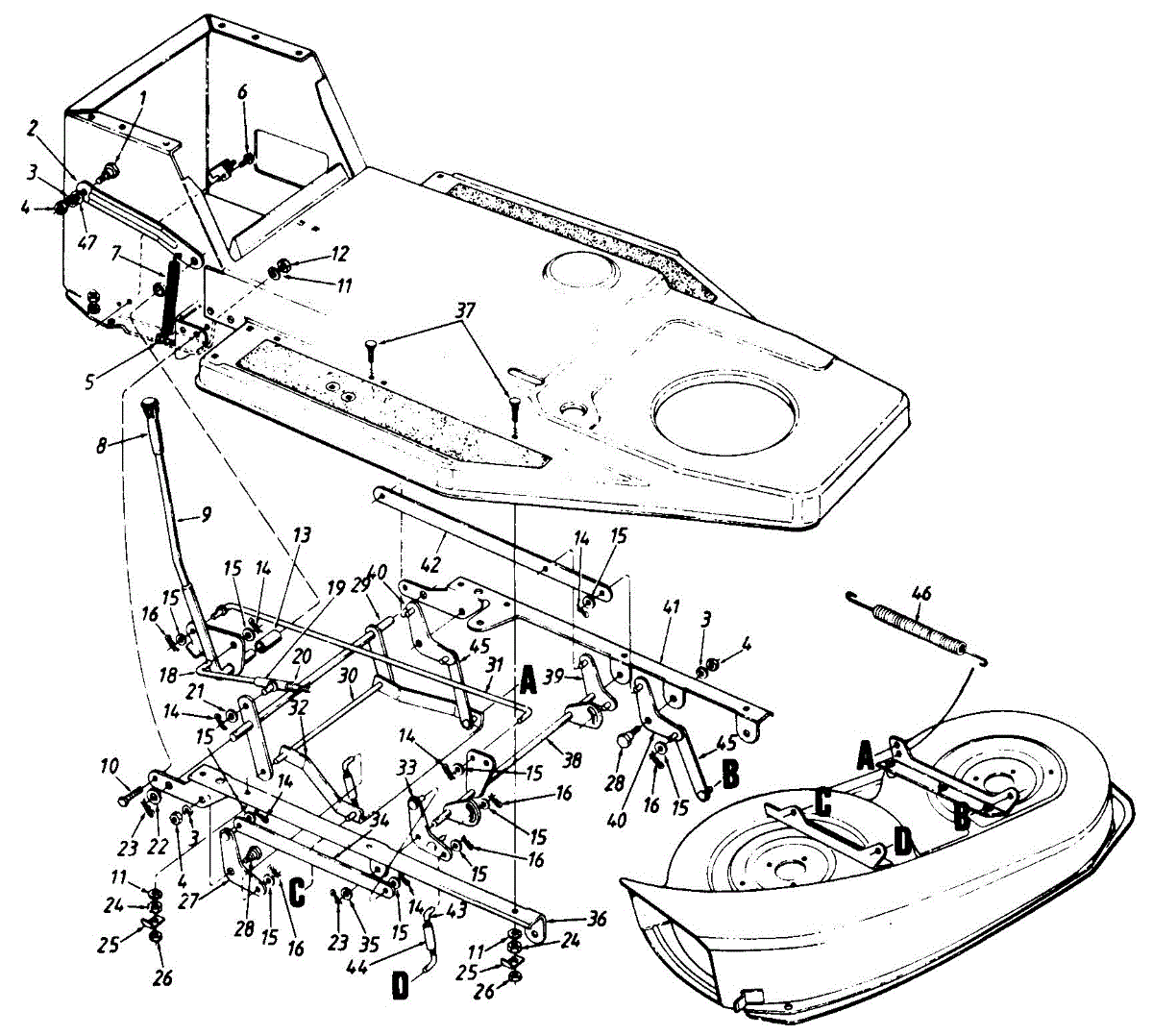 Deck lift adjustment link assembly for lawn tractors and walk-behind mowers. Replaces broken or worn linkage that connects deck height lever to deck.