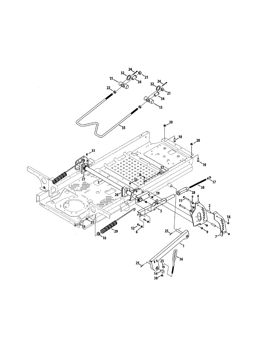 Front deck hanger rod for riding mowers. Connects and supports the mower deck at the front. Replace if bent, damaged, or missing for proper deck alignment.