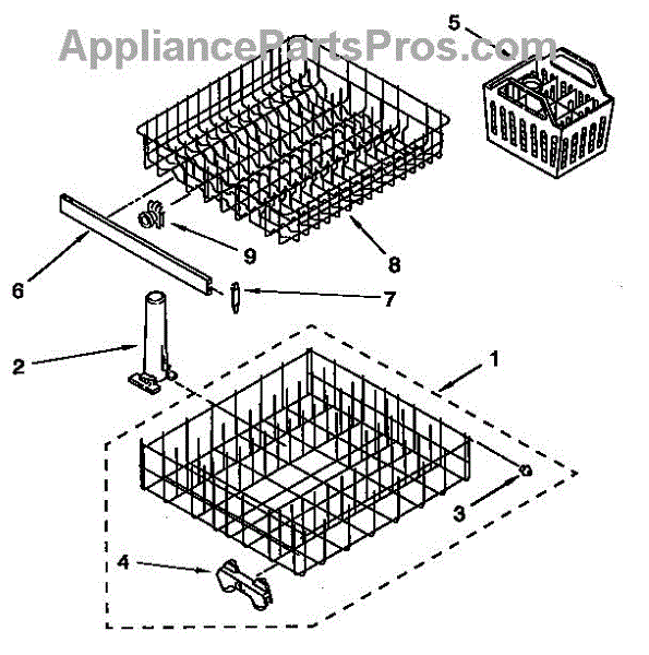 Protective rubber bumper for dishwasher dishrack. Installs on the outer front edge of the lower rack. Replace if cracked, broken, or missing.