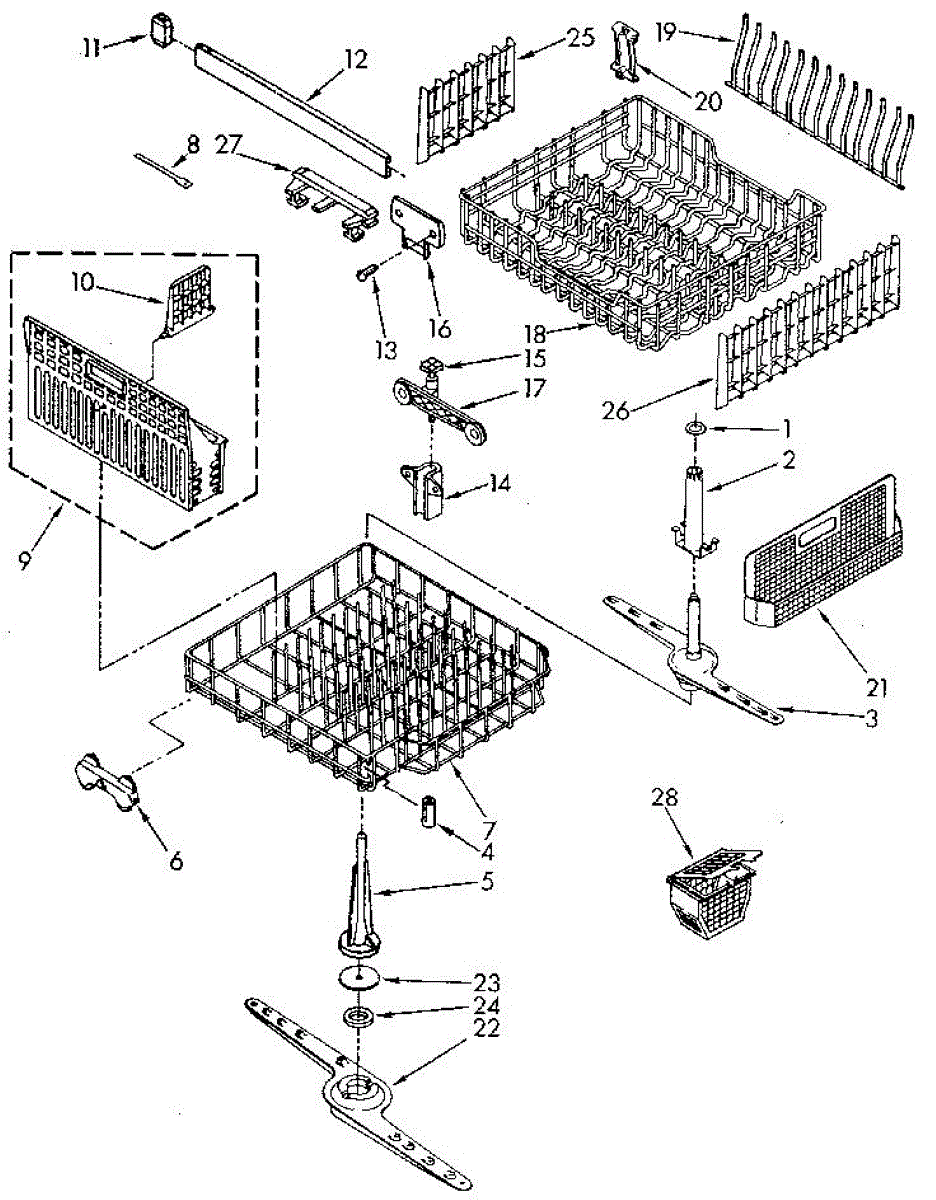 Replacement silverware basket for dishwasher lower rack. Holds utensils upright and separated during wash cycles. Order if yours is cracked or missing.