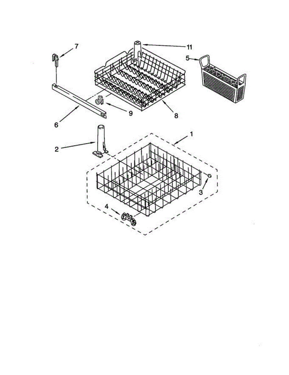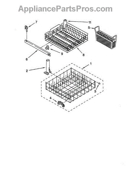 Replacement silverware basket for dishwasher lower rack. Holds utensils securely during wash cycles. Replace if cracked, warped, damaged, or missing.
