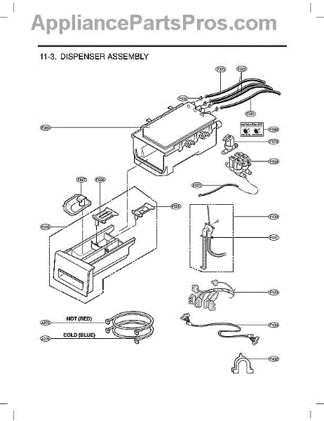 The Dispenser Assembly is an OEM part for LG front-loading washers. It is responsible for dispensing detergent and fabric softener at the appropriate times during the wash cycle. The dispenser assembly contains separate compartments for detergent and fabric softener, as well as timed mechanisms that release each additive when needed for cleaning and softening results.