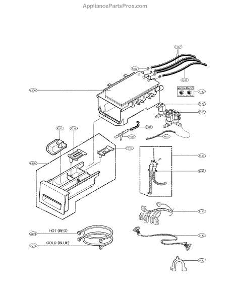 The Dispenser Assembly is an OEM part for LG front-loading washers. It is responsible for dispensing detergent and fabric softener at the appropriate times during the wash cycle. The dispenser assembly contains separate compartments for detergent and fabric softener, as well as timed mechanisms that release each additive when needed for cleaning and softening results.