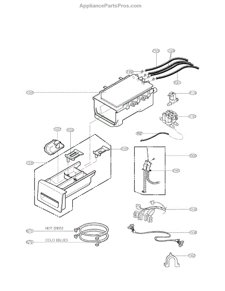 The Dispenser Assembly is an OEM part for LG front-loading washers. It is responsible for dispensing detergent and fabric softener at the appropriate times during the wash cycle. The dispenser assembly contains separate compartments for detergent and fabric softener, as well as timed mechanisms that release each additive when needed for cleaning and softening results.