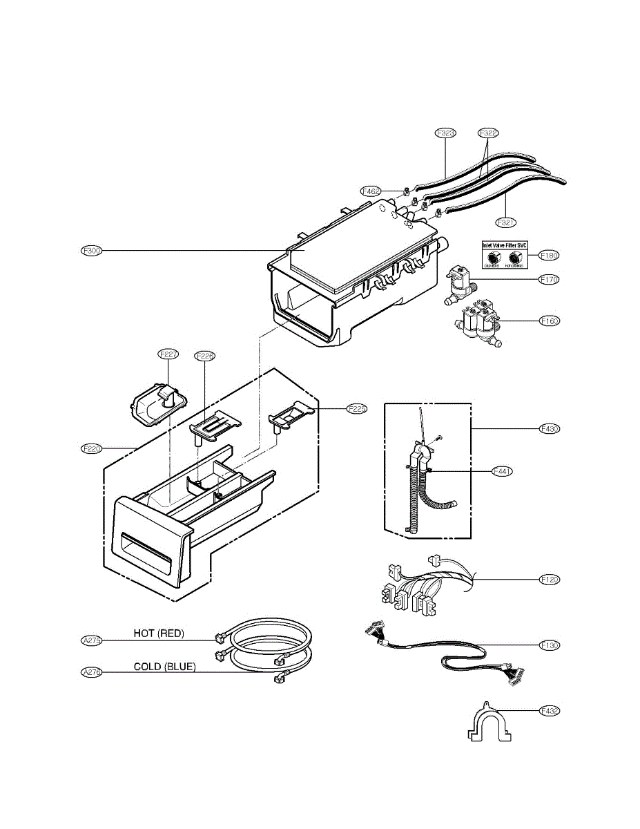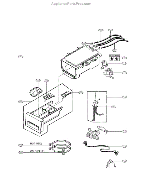 Directs water from inlet valve to detergent dispenser in LG washers. Replace if hose is cracked, leaking, won't stay attached, or damaged from wear.