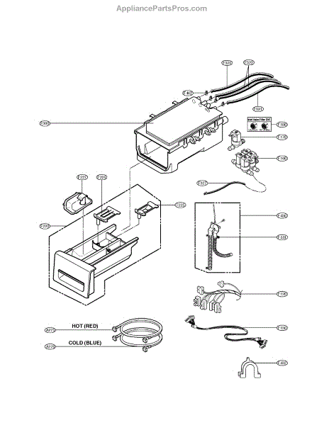 The Dispenser Assembly is an OEM part for LG front-loading washers. It is responsible for dispensing detergent and fabric softener at the appropriate times during the wash cycle. The dispenser assembly contains separate compartments for detergent and fabric softener, as well as timed mechanisms that release each additive when needed for cleaning and softening results.
