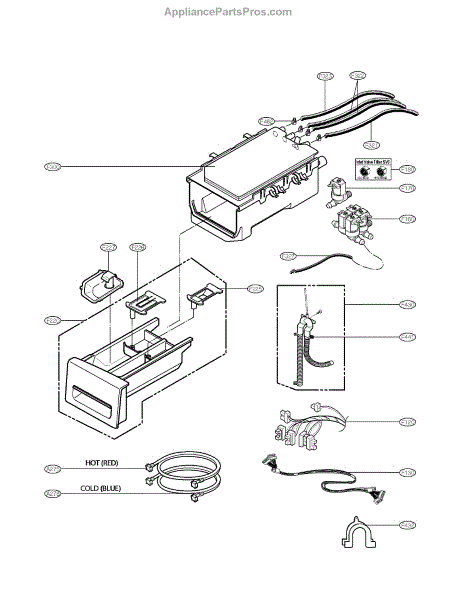The Dispenser Assembly is an OEM part for LG front-loading washers. It is responsible for dispensing detergent and fabric softener at the appropriate times during the wash cycle. The dispenser assembly contains separate compartments for detergent and fabric softener, as well as timed mechanisms that release each additive when needed for cleaning and softening results.