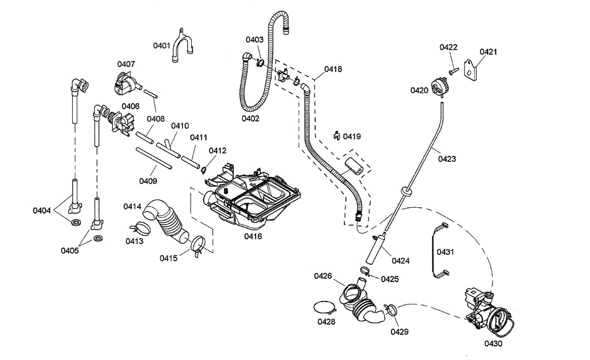 Washer sump assembly that houses the drain pump and connects hoses at the bottom of the tub. Replace if cracked, leaking, or damaged from wear.