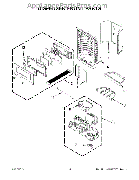 This dispenser separator assembly forms the interior of the refrigerator's ice/water dispensing area. It guides ice and water into your glass and helps seal the chute to limit warm air intrusion, drips, and frost at the opening.