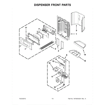 This dispenser separator assembly forms the interior of the refrigerator's ice/water dispensing area. It guides ice and water into your glass and helps seal the chute to limit warm air intrusion, drips, and frost at the opening.