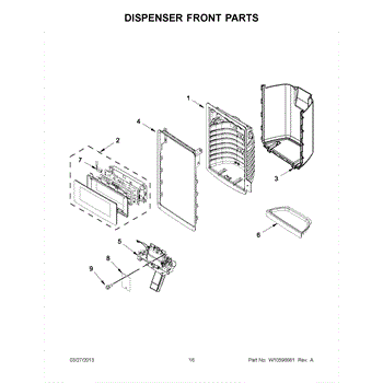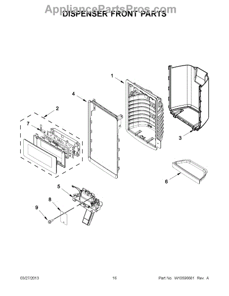 This dispenser drip tray sits beneath the ice/water dispenser recess to catch small drips and spills. Replacing a cracked or missing tray helps protect the door and floor while keeping the dispenser area neat and easier to clean. What it does: